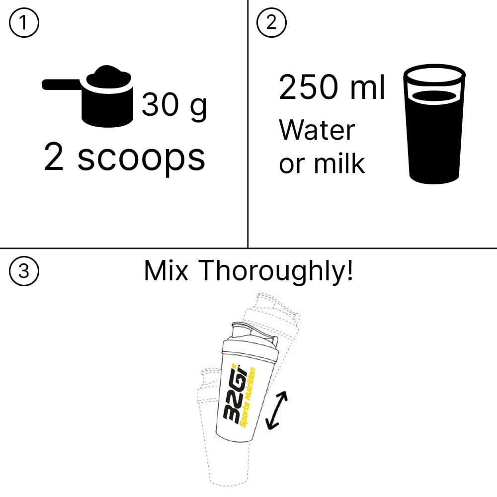 Mix 2 flat-Scoops (30 g) with 250 ml of water or your favourite milk, or add to your smoothie blend.