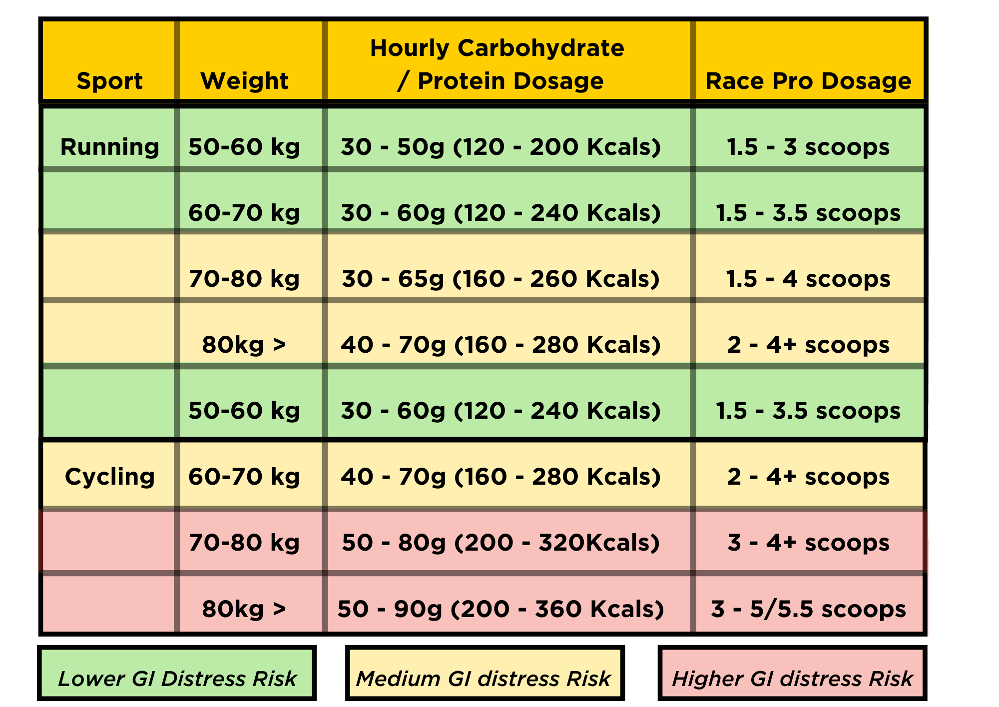 STANDARD SERVING SIZE - Mix 4 scoops of Race Pro with 650 - 750 ml water (56 g Carbohydrates + 8.7 g Protein).